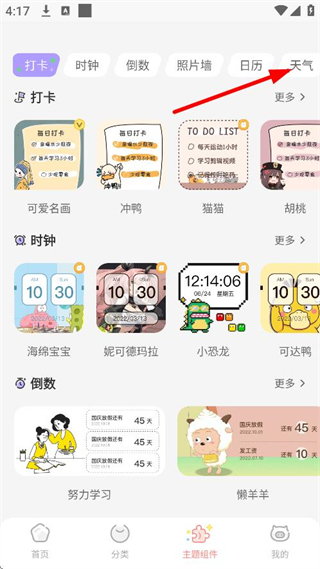 2. 在主题组件页面当中,点击“天气”选项,即可进入天气组件分类页面。