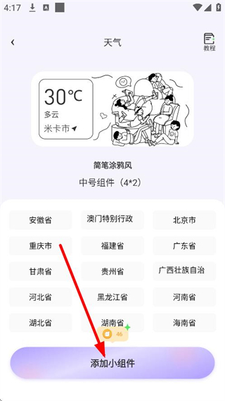4、进入组件详情页面后,点击“添加小组件”,即可完成天气小组件的添加操作。