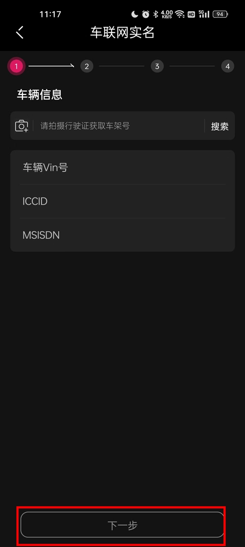 4、进入车辆信息绑定页面后,填写车辆的车架号、VIN号、ICCID、MSISDN等相关信息。