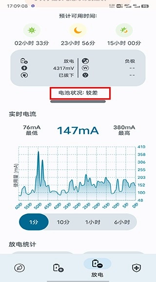 3、在“放电”页面可查看电池状况和实时电流输出;