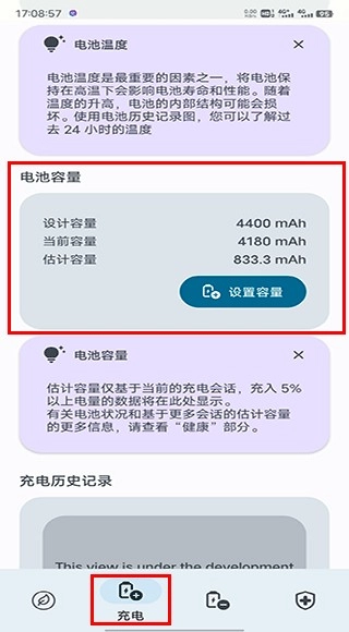 2、点击“充电”按钮,下滑页面查看电池容量,了解电池出厂容量及预估寿命;
