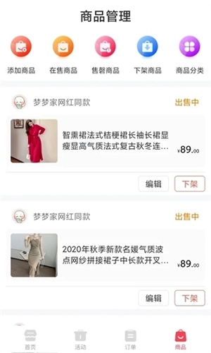 5、进入商品板块,查看各类商品的销售状况,可一键完成商品编辑及上下架操作