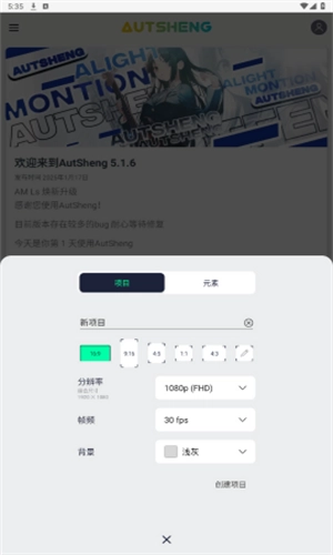 2、支持对项目名称、宽高比例、分辨率、帧速率以及背景颜色进行设置。
