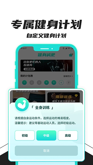 支持用户个性化录入自身身材数据,再结合其选定的运动难度等级,系统会智能生成专属且详尽的训练方案,助力用户提升健身效率。