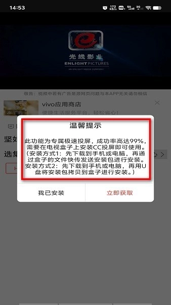 要是第一种投屏方式没成功,就试试第二个“投电视(专属)”功能。不过这个功能得先在电视上安装cc投屏应用,之后再操作投屏,步骤会稍微繁琐一些,但投屏的成功率几乎能达到100%。