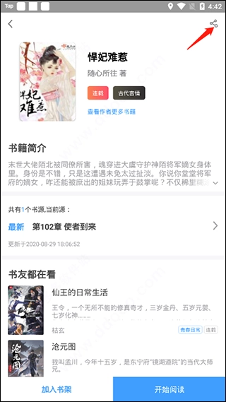 在书籍详情页面,屏幕右上方,点击【分享】按钮。