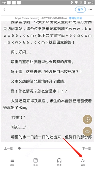 在阅读页面中轻点屏幕中央位置,底部会弹出菜单,此时点击【设置】选项即可。