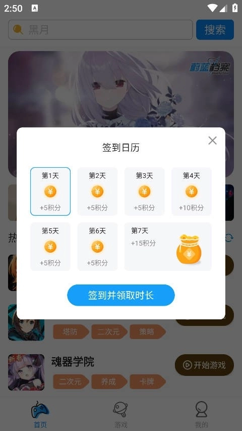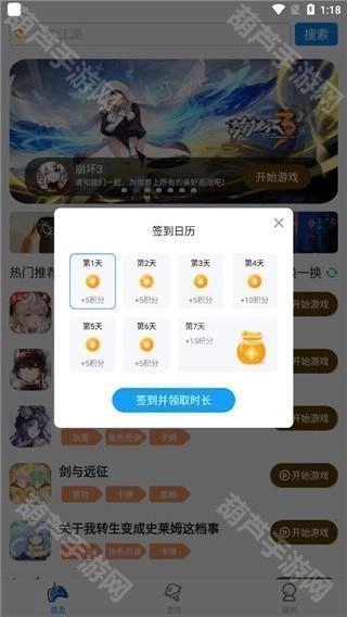 2.软件启动后会自动弹出签到日历,我们每天签到都能获得积分,用这些积分可以兑换游戏时长。
