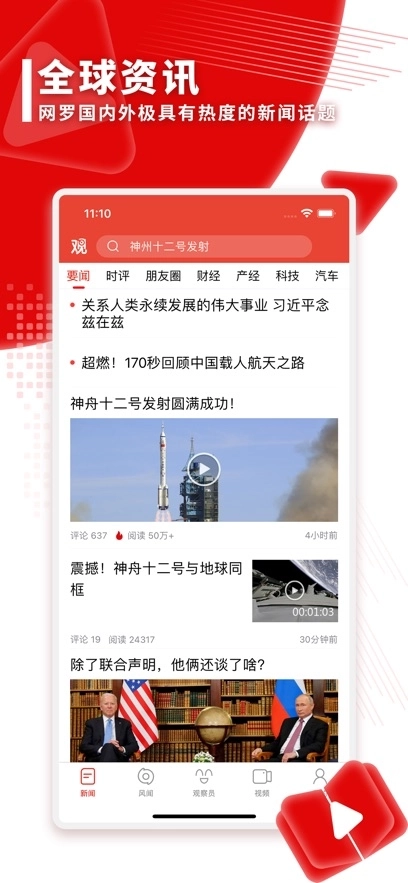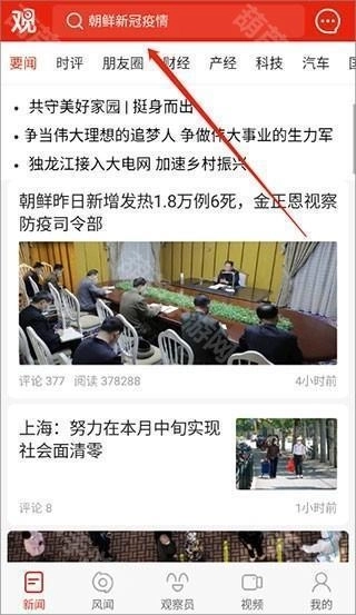 1、安装软件并进入首页后,你可以在这里查看每日实时更新的要闻、时评以及各类新闻内容,同时还能通过顶部的搜索框进行新闻搜索。