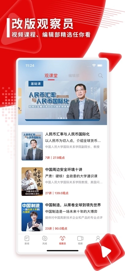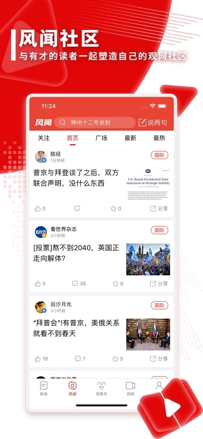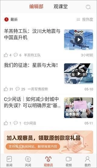 3、进入【观察员】页面后,能看到平台为你筛选好的新闻内容,便于用户及时了解实时新闻热点。