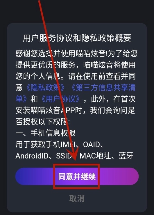 1. 接着安装喵喵炫音App,打开该应用后,点击【同意并继续】按钮。