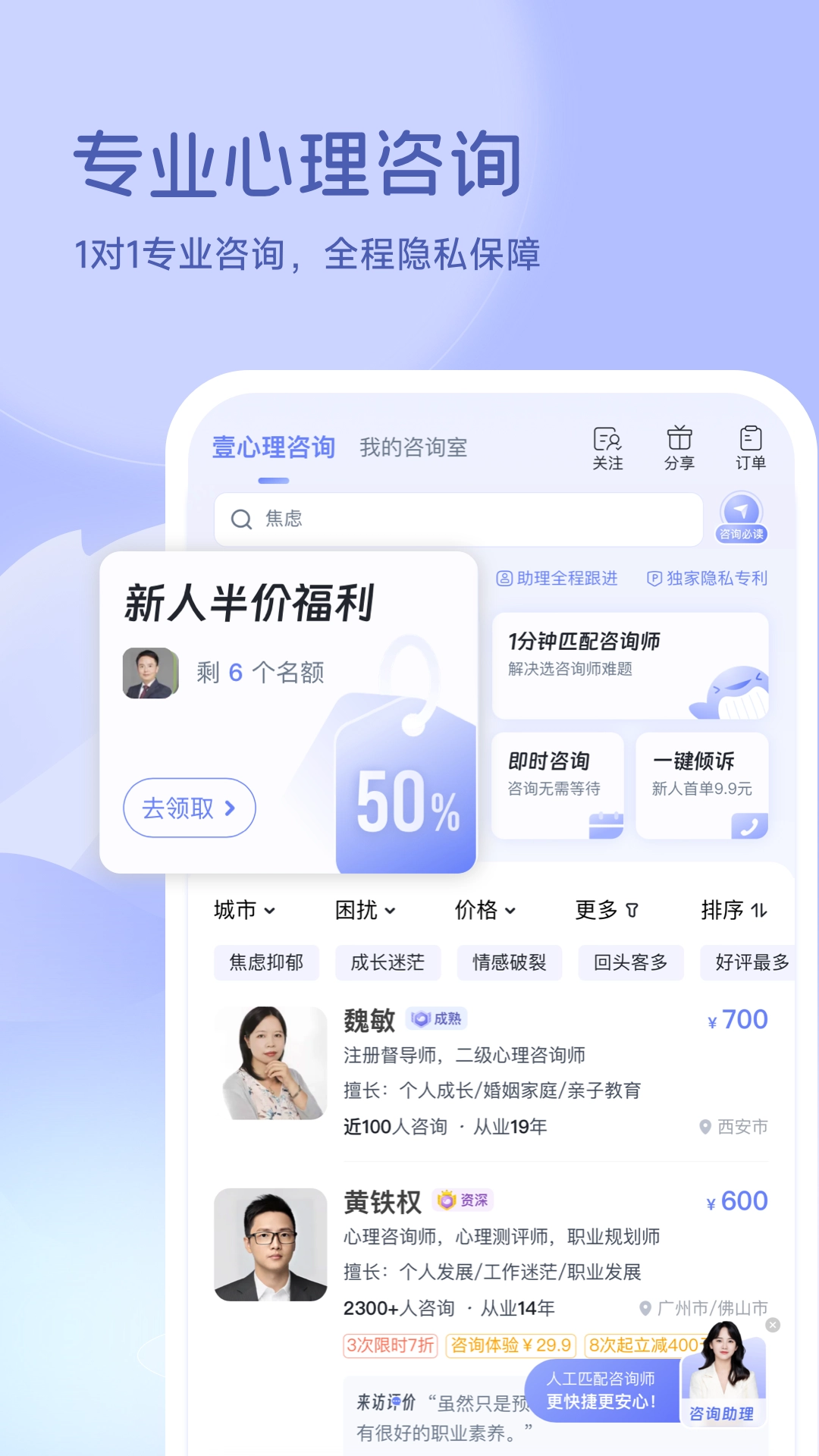 2、专业心理咨询:壹心理咨询专家委员会正式成立!专业评审团队优中选优,以低于2%认证通过率严选600多名专业咨询师。来壹心理,找优质、靠谱的心理咨询服务。