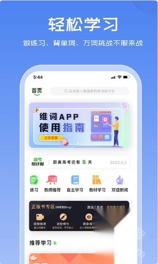 2、同步课堂教学:同步教学进度、教材预习,课堂更轻松,精选练习、作业、老师推荐,学习有的放矢,词汇分级、话题学习,高考备考更轻松