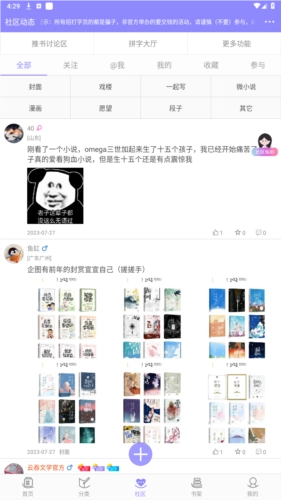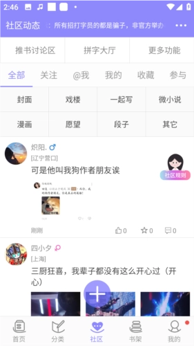 6、社区动态可以分享标记日常生活,写作讨论区可以交流写作经验、求助写作问题,推书讨论区可以分享自己喜欢的作品。