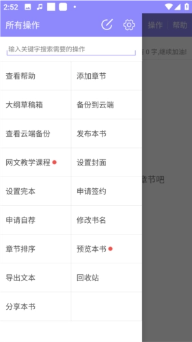 6、新建小说完成后,点击所创作的书可进入后台操作页面,在这里可以实现添加章节、设置封面、发布本书等功能。