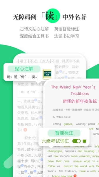 3,无障碍阅读体验:收录古今经典作品,支持字词点击即查、智能标注分级字词和易错字词。