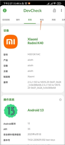 首先我们先打开DevCheck,在上面的列表中找到【电池】,点击它进入电池页面。