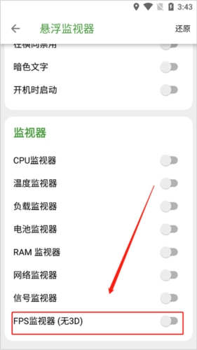 3、然后在就来到悬浮监视器页面,在这里拉到最下面,可以看到FPS监视器的功能,它就是帮助我们显示帧数的功能了。