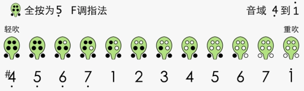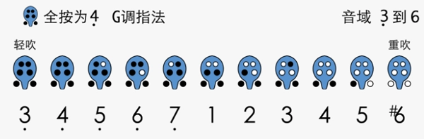 最后介绍一种全按(不包括食指所负责的那两个小孔)为低音4的指法,可以吹出低音2到中音6的音阶。不过这种指法因为含盖的音域有限,所以很少使用。