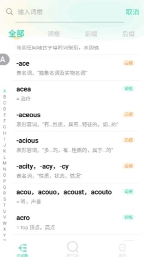 学、测一体的背词模式。支持背单词、背词根、背词缀等方式分类背词,词根优先背。开启背词提醒,养成良好背词习惯。