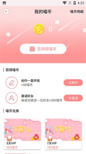 2、通过签到和完成任务能够获取喵币,当积累到足够数量的喵币后,就可以兑换VIP,进而解锁更多VIP专属功能。