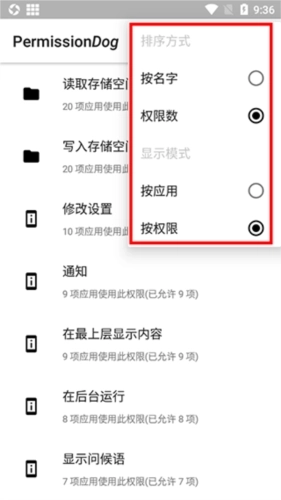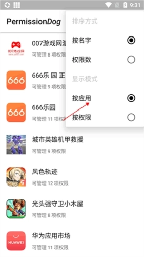 1、先把权限狗安装好,打开应用后点击右上角那三条横线的图标,接着选择应用排序或者权限排序。