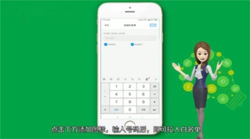 4、最后点击下方的“添加”图标,输入号码后,就能将其加入白名单。