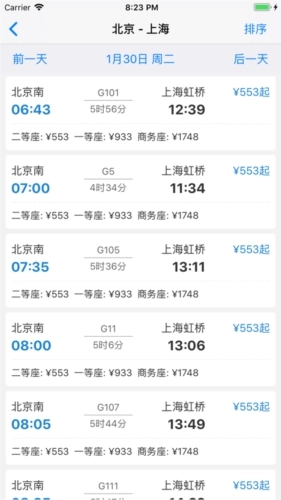 5、直接输入出发地与目的地,即可查询到可乘坐的车次,同时还能获取各车次对应的时间段、行程历时、票价等丰富信息。