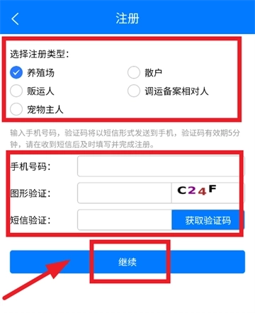 根据身份选择对应的注册类型,输入手机号、图形验证码和短信验证码后,点击“继续”按钮即可完成这一步操作。