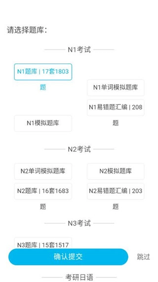 3、题库涵盖多种类型,像N1考试、N2考试、N3考试、考研日语等都包含在内,选好相应类型后点击提交即可。