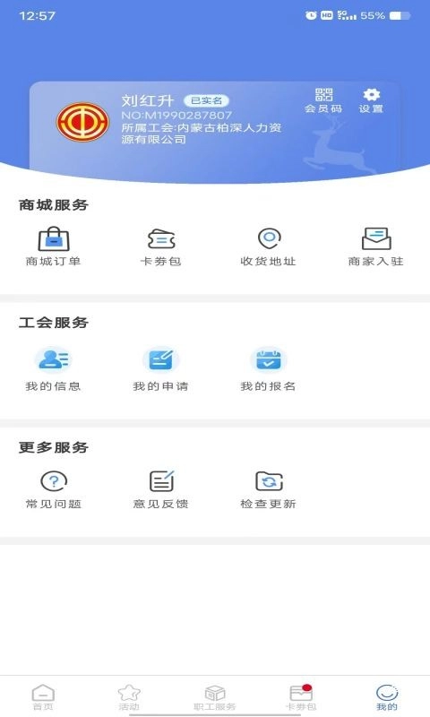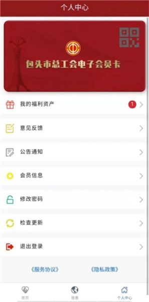5、个人中心板块主要用于展示工会会员卡。会员在此可查看自身的福利资产、会员卡操作说明、个人会员信息,还能检查系统版本更新、浏览公告通知,同时支持密码修改功能,也可提交修改意见与反馈建议。