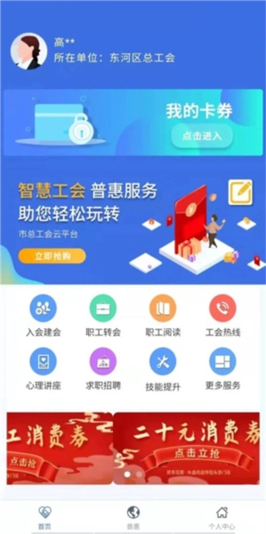 包头市总工会为全市职工打造的移动工会服务平台,整合了入会、维权、帮扶、保障、服务等功能,致力于为职工提供高效、便捷、贴心的服务。平台为职工带来丰富福利与权益,入会即可享受更多帮扶项目,助力解决日常生活难题。每逢节假日,平台还会发放福利,职工可在线领取核销,实现线上申领、线下消费。此外,平台设有职工阅读、工会热线、心理讲座、求职招聘、技能提升等职工熟悉的“工会阵地”。