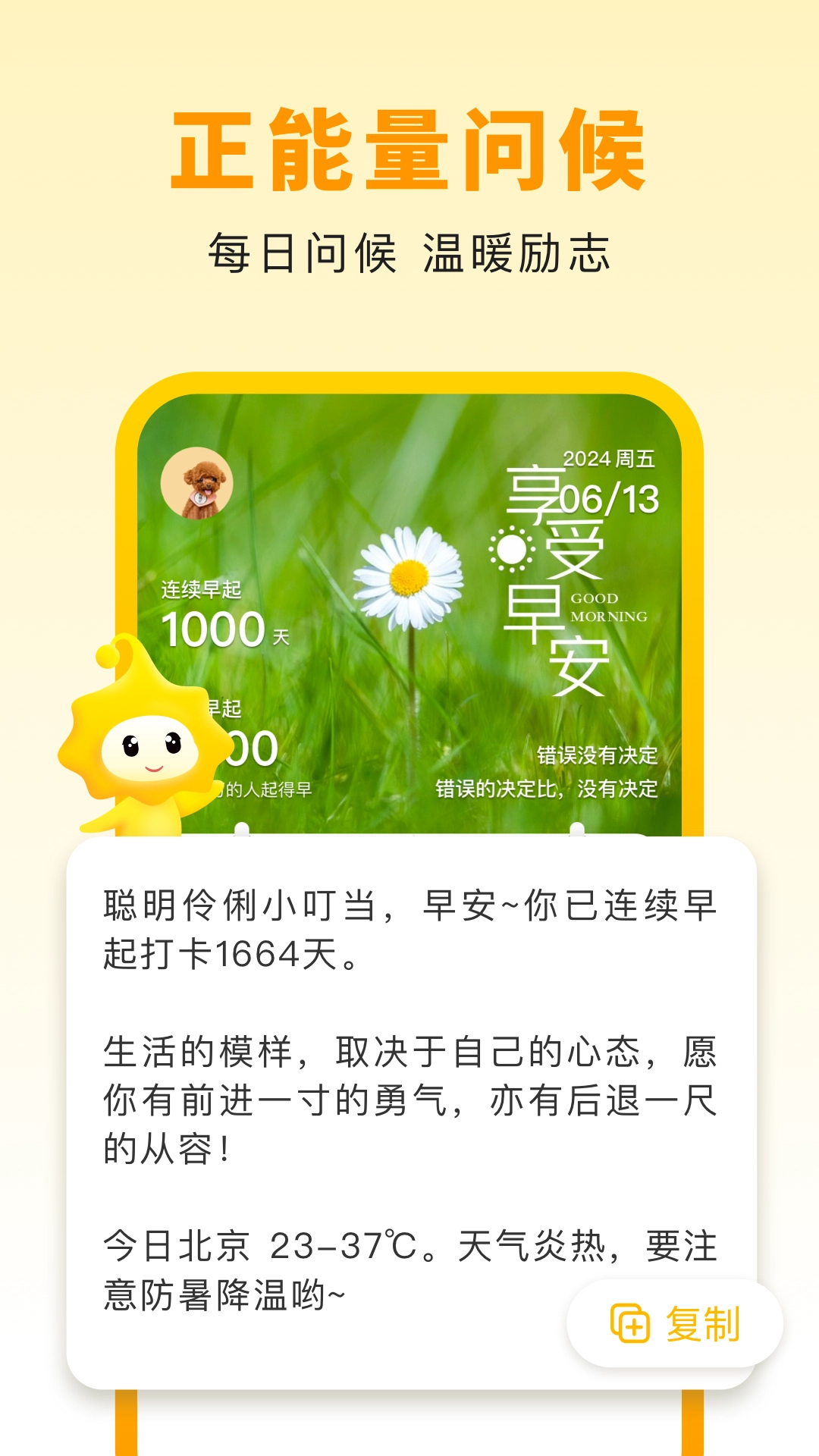每日提供专属定制的语音问候,还有贴心的天气提示,以及好友陪伴打卡等关怀服务。