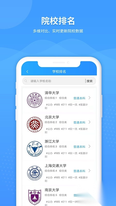 1、通过院校查询,能够获取全国1000多所院校的详尽信息,其中涵盖历年分数线、招生计划、开设专业、就业状况、学费信息、创建时间、重点学科、隶属机构、学校类型、学校规模以及博士点数量等方面的介绍。