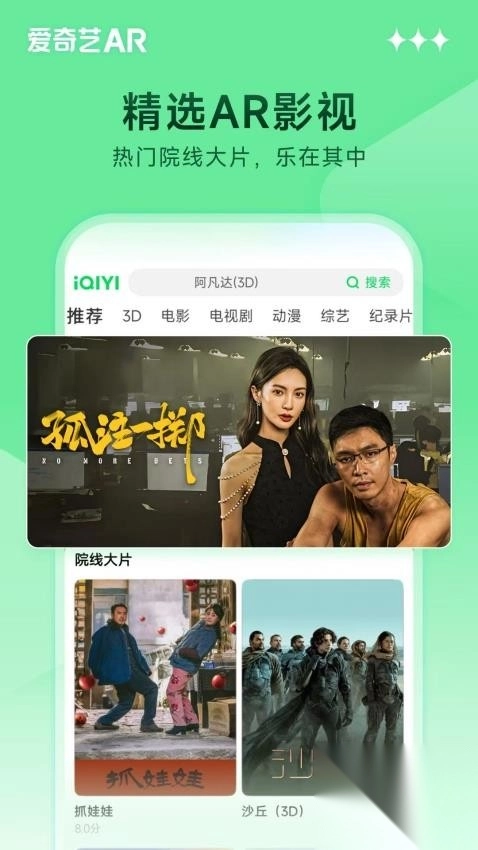 爱奇艺AR,由北京爱奇艺科技有限公司精心打造,是一款专门适配AR眼镜的应用。它实现了自制全息内容与AR终端的深度结合,为用户呈现出前所未有的沉浸式娱乐互动感受。借助这款应用,用户能够在AR眼镜上尽情畅享爱奇艺海量的影视、综艺以及动漫资源。它为AR眼镜使用者打造了全新的观影模式,3D内容精彩纷呈,沉浸感十足。其界面设计充分贴合AR设备特点,操作起来简单方便。在此,推荐有需求的用户下载并使用。