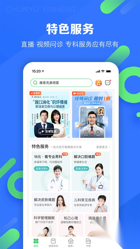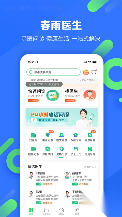 “线上看病”:足不出户就可以和医生线上交流,支持图文\电话\视频多种沟通方式,不是只有生病了才应该找医生。医生还会提供挂号、私人医生等服务,保证您线上+线下的完整咨询体验;