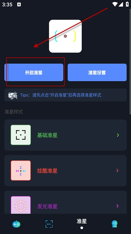 3、轻点底部“准星”图标,首先点击“开启准星”,接着从众多样式里挑选合适的准星,完成设置后,准星便会在游戏中生效。