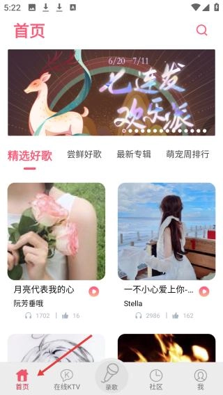 1. 点击进入首页,在页面顶部可以看到活动宣传。同时,这里设有精选好歌等分类,每个分类下会展示歌曲的封面、名称、播放量以及评论数。