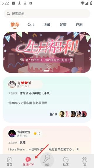 2. 轻点在线KTV页面,页面上设有搜索栏,还划分有推荐等各类标签,会展示房间号、演唱曲目,另外还有生日福利活动。