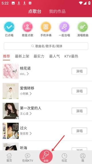 3、点击录歌界面,该界面包含点歌台和我的作品,具备点歌功能,同时设有推荐歌曲列表,点击即可开启演唱。