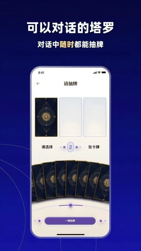在对话过程中,可随时抽取塔罗牌,借助塔罗牌解读,为用户在爱情、事业以及生活抉择等方面提供指引,助力用户探寻内心思绪与未来发展方向。