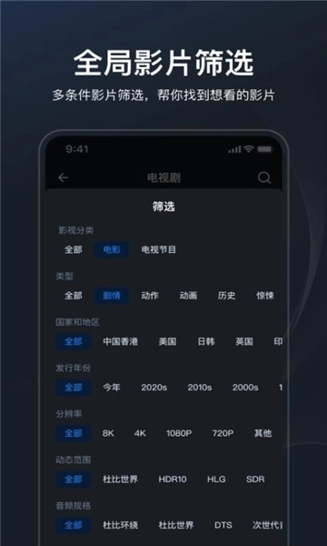 提供基于影片信息的多条件影片筛选功能;支持对片名、演员进行全局搜索,助您快速找到想看的影片。