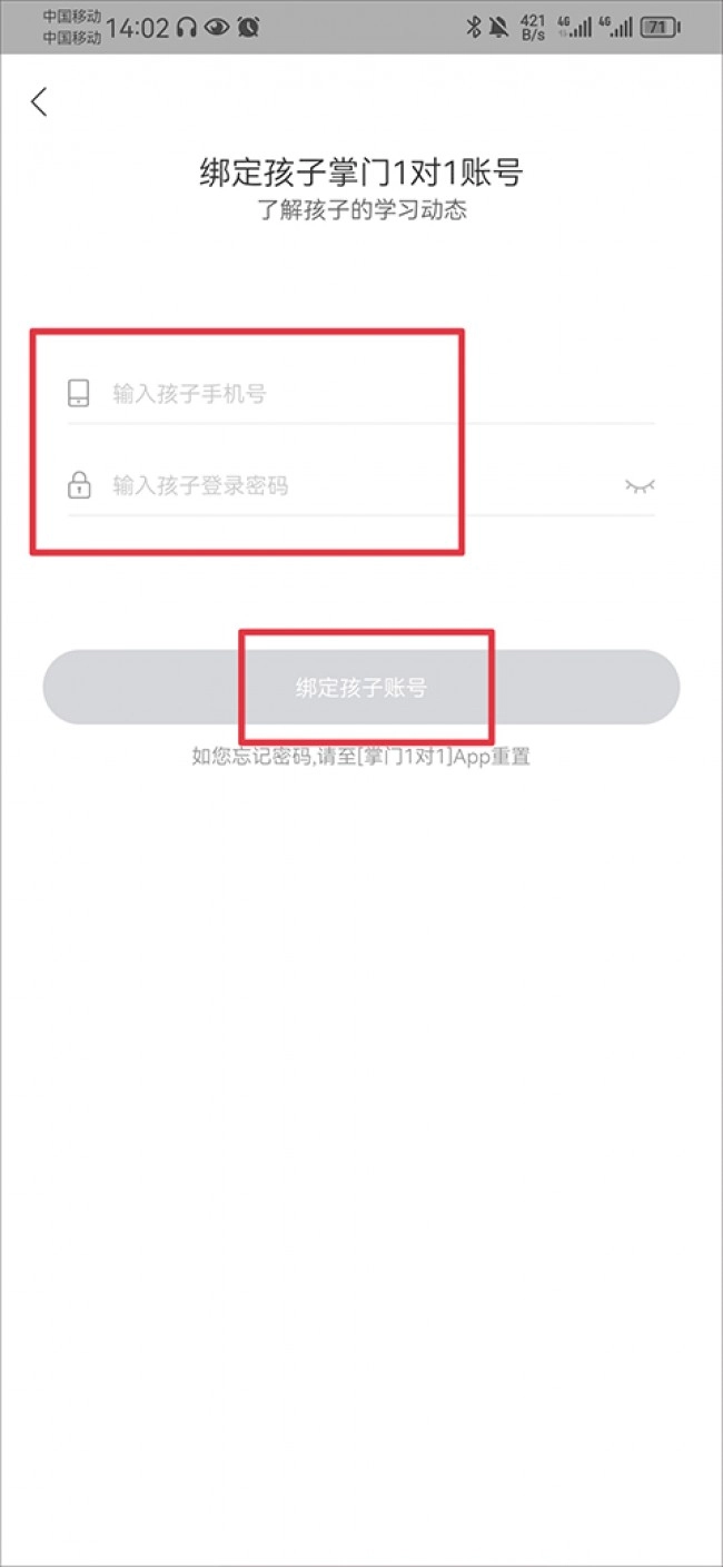 3、于登录页面输入孩子的手机号码与密码,接着点击绑定孩子账户。若忘记密码,需前往掌门人1对1 APP重新设置。