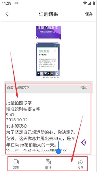 5、在识别结果页面,您能够对照图片编辑文本,还能一键进行复制、翻译、分享操作,亦或把文本保存下来。